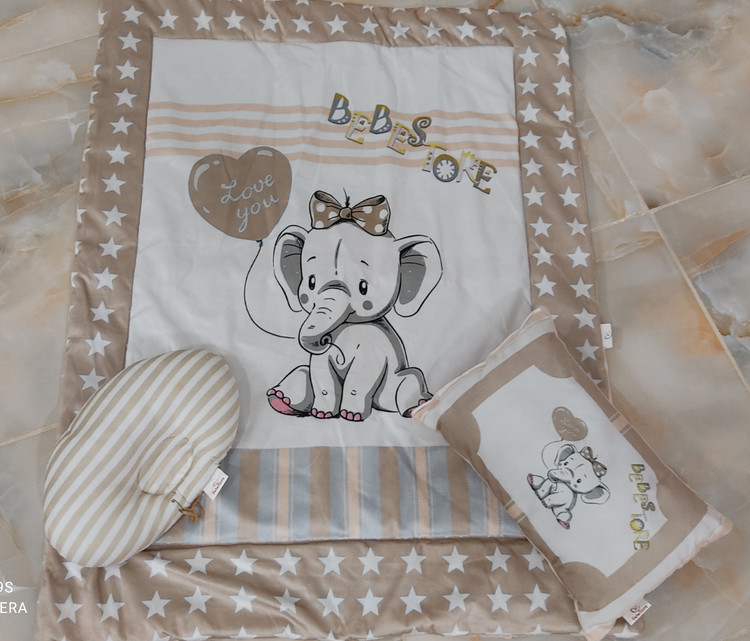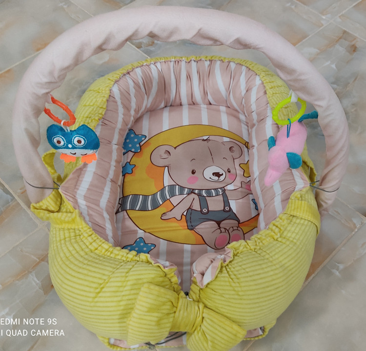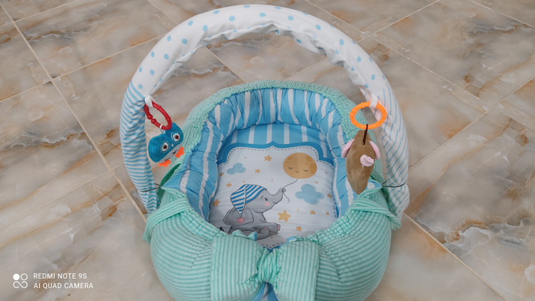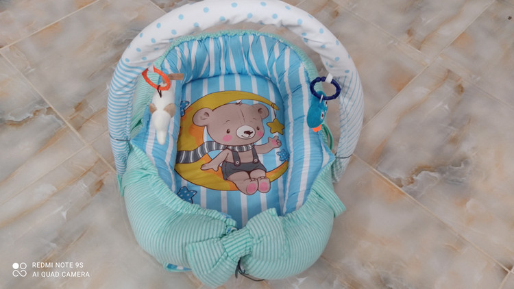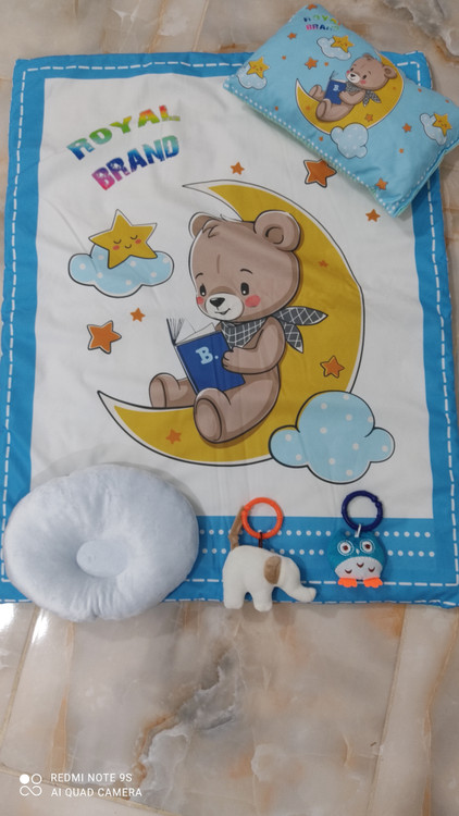 اقلام همراه: تشک لبه دار باتومی و حلقه و عروسک و بالشت شیردهی و پتو و بالشت استراحت